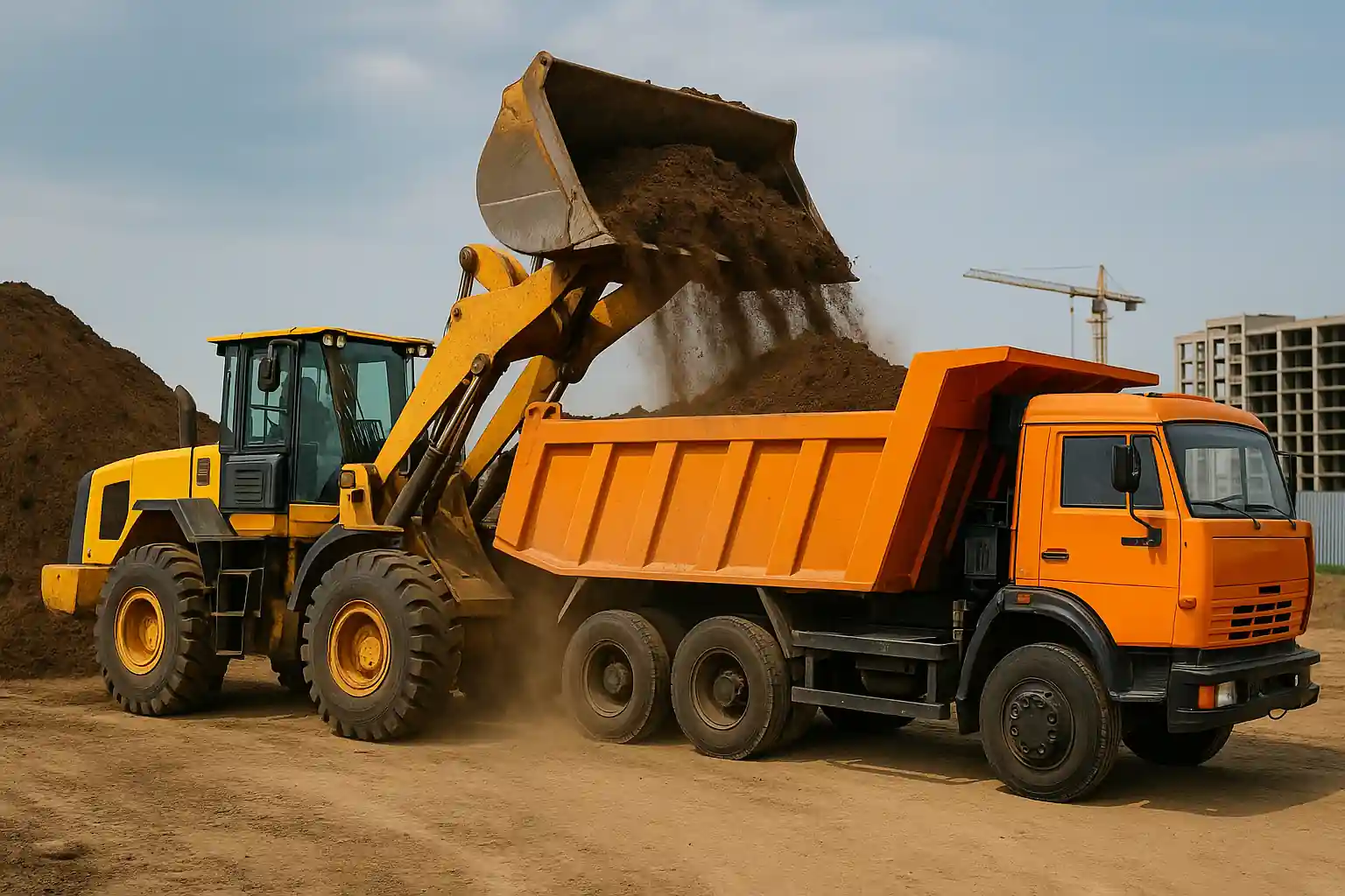 - Погрузка и вывоз грунта: связка «погрузчик + самосвалы»